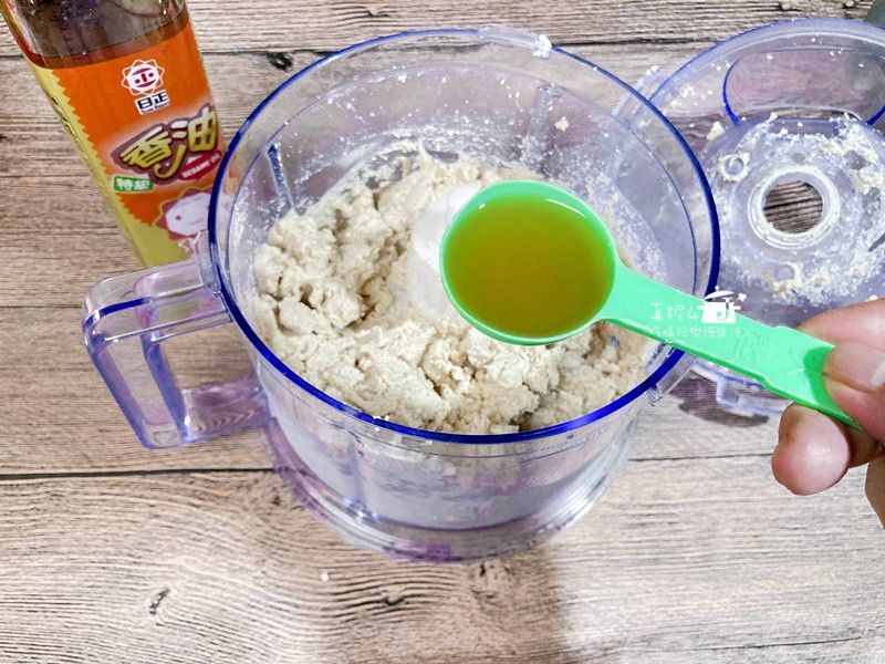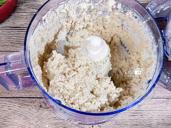 白色豆干先用熱水川燙去豆腥味後瀝乾放涼,用調理機打磨成極細緻的泥狀後