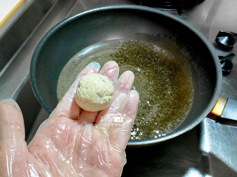 3.丸子下鍋前用掌心再搓圓幾下,一顆一顆沿著鍋邊滑入,千萬不能用丟的!油會濺出來