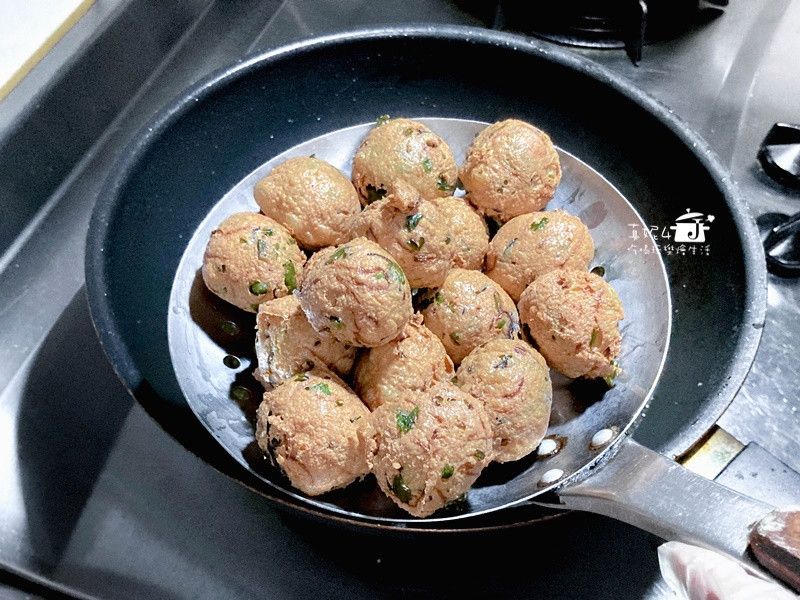 丸子下鍋不要馬上去翻攪,等貼著鍋底的豆定型結痂後會慢慢飄上來再用長筷子去輕輕推動讓丸子的各角度都上色後就可以起鍋