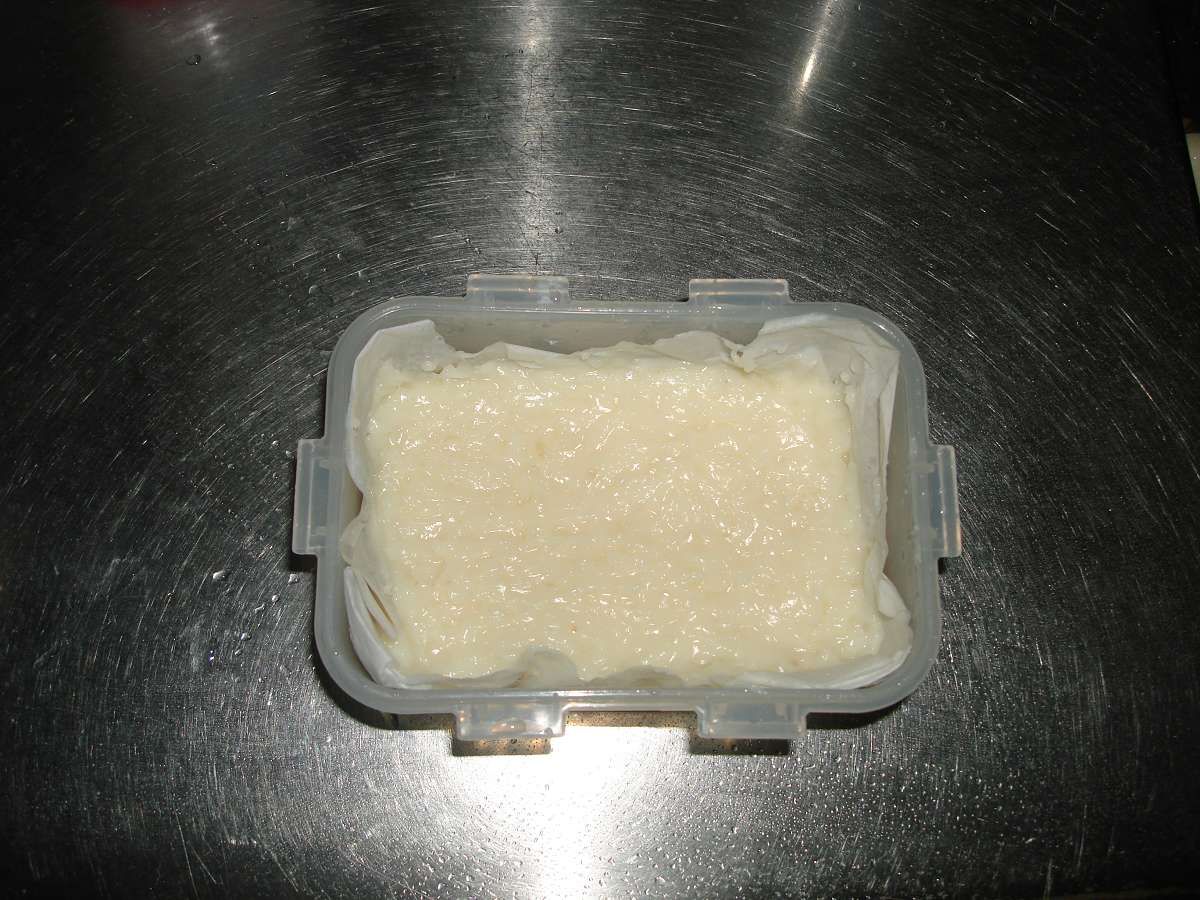 鋪上烘培紙,將奶凍餡倒入盒中,最後入冰箱冰至凝固即可....